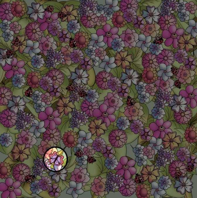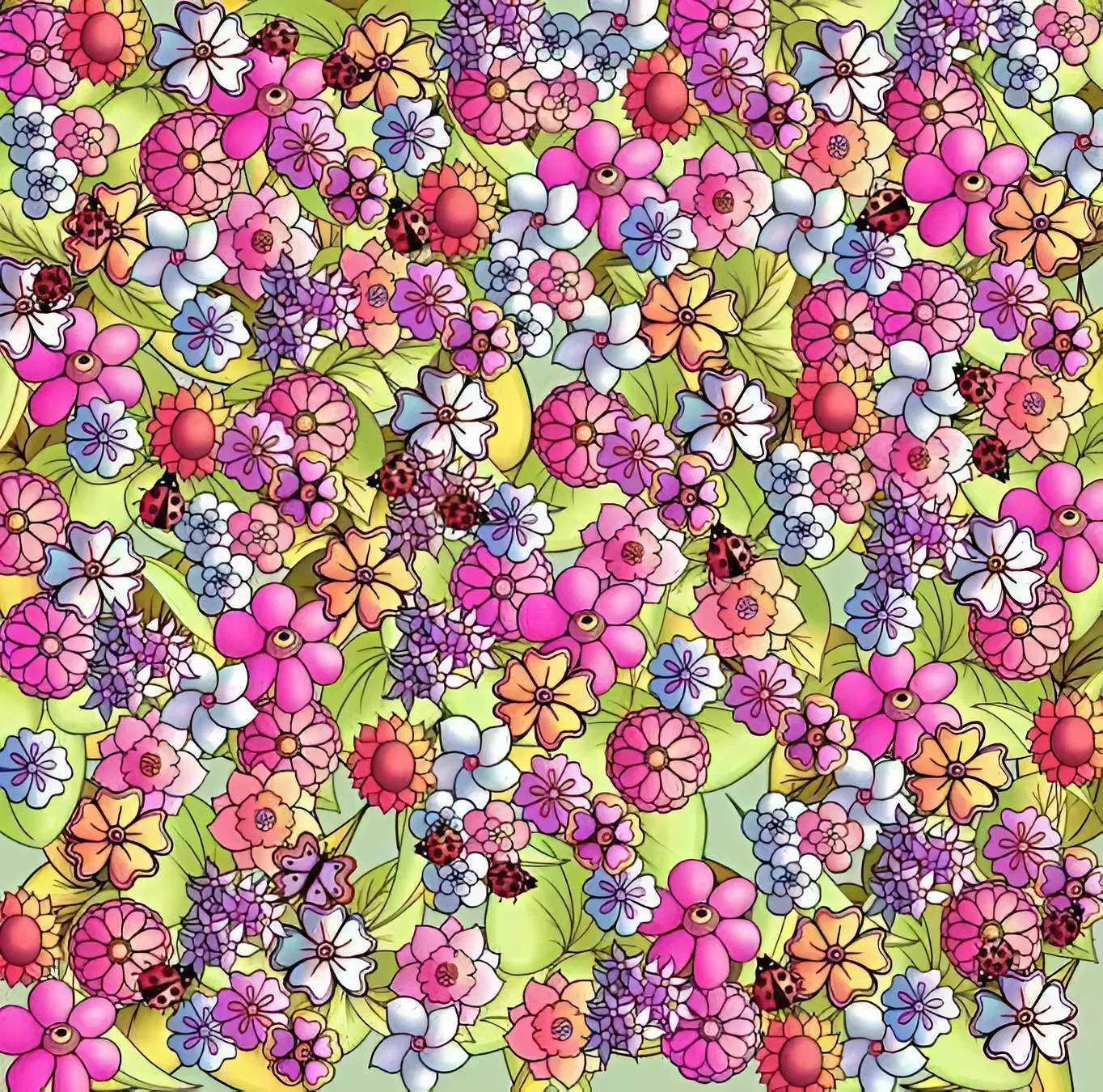 Das Bild selbst ist ein wahres Farbenfeuerwerk: Rosa, Gelb, Lila und Grün, mit Blumen, Blättern und kleinen Insekten, die alle um unsere Aufmerksamkeit wetteifern. Die Herausforderung besteht darin, den