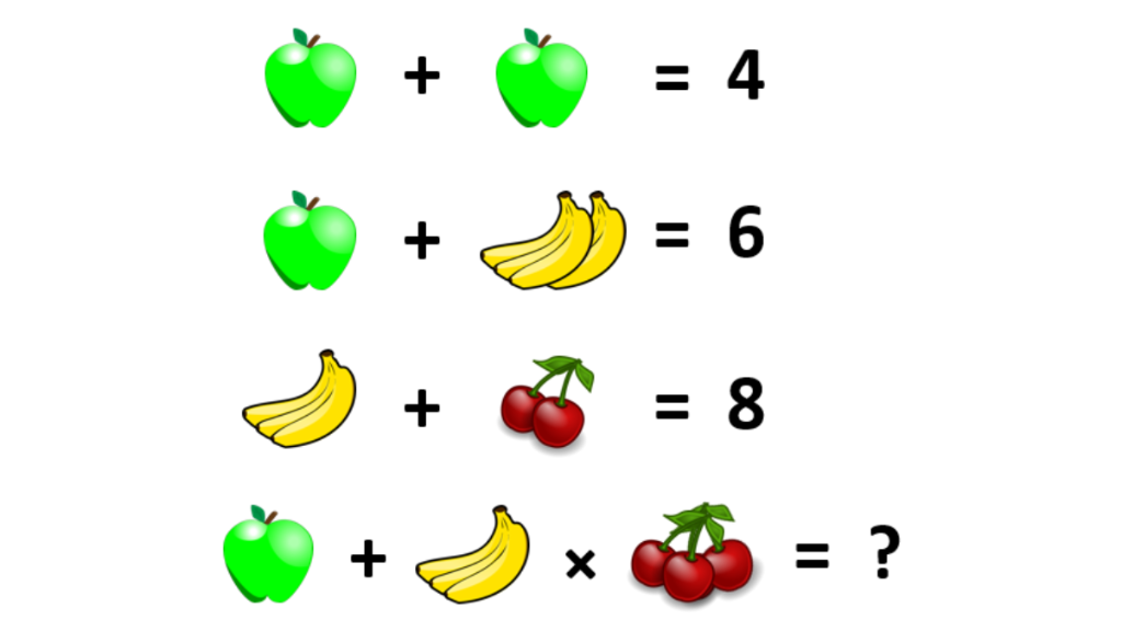 Das Rätsel beginnt also, Gestalt anzunehmen, aber die letzte Gleichung bringt uns noch einen Schritt weiter. Hier müssen wir den Apfel, die Banane und die Kirschen in einen mathematischen Ausdruck kombinieren. Wir sehen einen grünen Apfel plus eine Bananen-Traube, die mit den Kirschen multipliziert wird. Dies ist der entscheidende Punkt, an dem viele Menschen verwirrt werden, da die Multiplikation Vorrang hat.