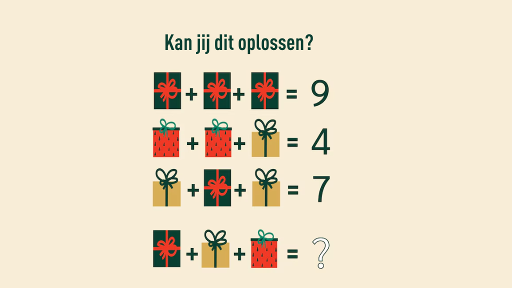 In der ersten Reihe sieht man drei schwarze Geschenke mit roter Schleife. Gemeinsam ergeben sie einen Gesamtwert von neun. Die Aufgabe lautet also, den Wert eines einzelnen schwarzen Geschenks zu bestimmen.