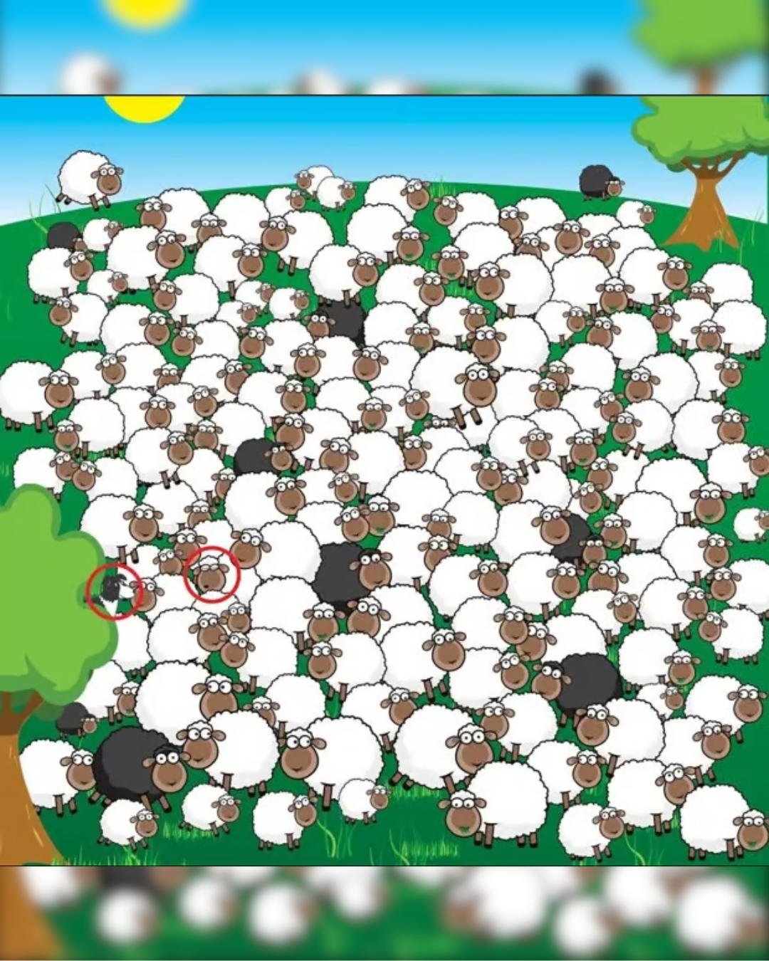 Die Border Collie befindet sich in der linken unteren Ecke, halb versteckt hinter einem weißen Schaf neben einem Baum. Seine dunkle Fellfarbe und seine charakteristischen Ohren machen ihn schließlich erkennbar, doch er hat sich clever verborgen.